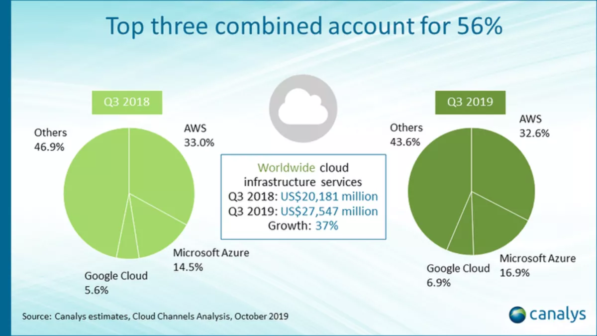 The worldwide cloud infrastructure services market is now worth US$27.5 billion, with market leader Amazon Web Services taking out 32.6% of the entire market share in Q3 2019 – although Microsoft Azure is hot on its heels.